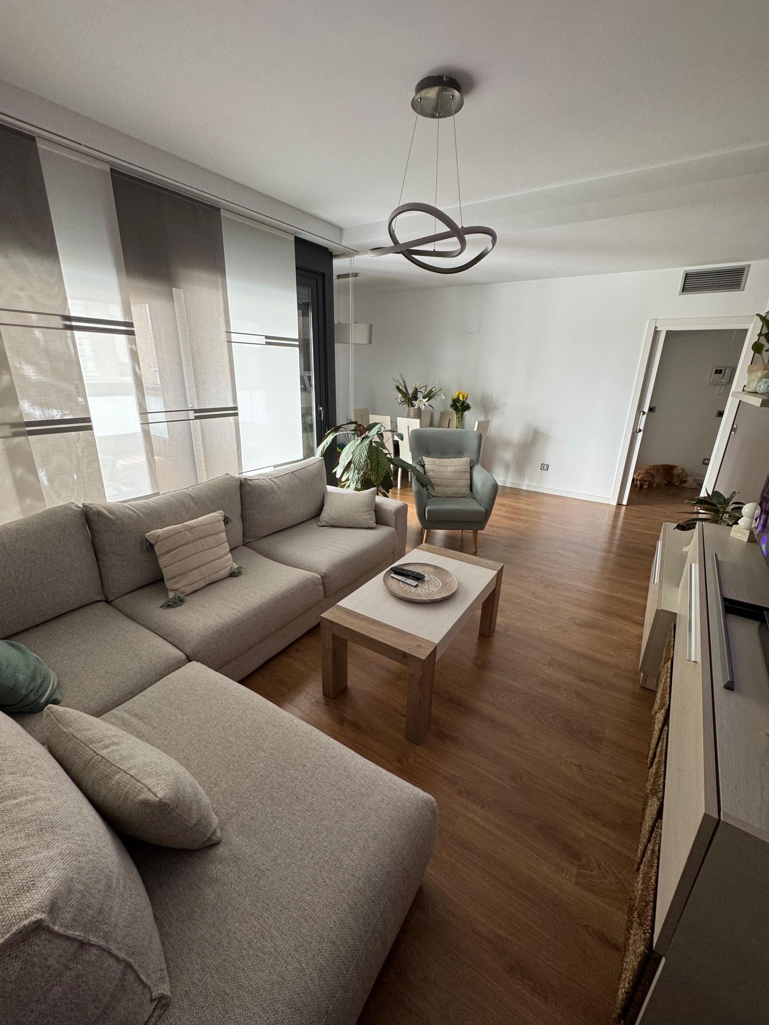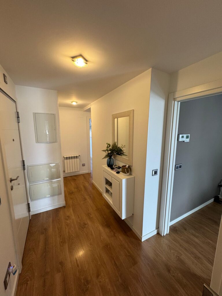 Huset är byggt 2017 och har en bekväm planlösning med differentierade ytor. När vi går in kommer vi in i en hall med garderob, och till höger finns huvuddelen med ett stort vardagsrum med tillgång till en täckt terrass och det fullt utrustade köket med tvättstuga.