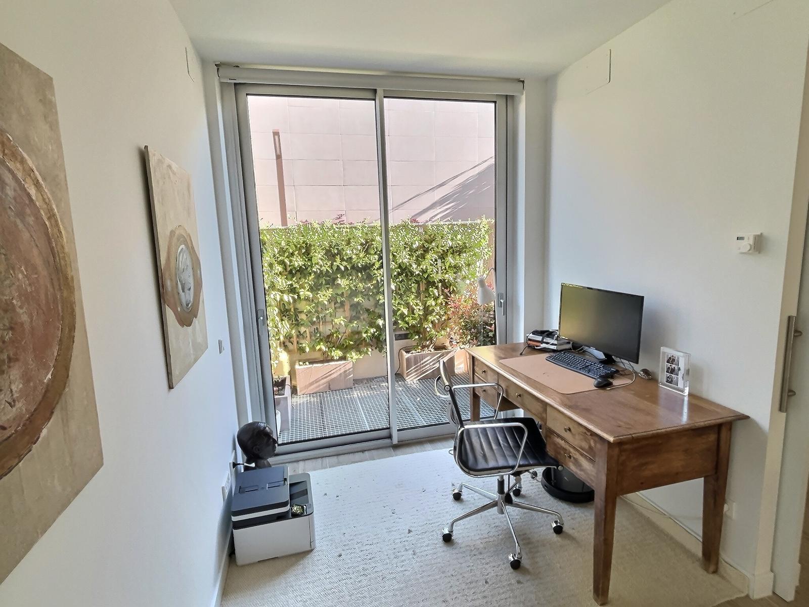 Vi når huset genom en hall, ett vardagsrum i två rum med matplats och tillgång till en trevlig veranda som leder till den privata trädgården, ett fullt utrustat kök med avancerade vitvaror även med tillgång till trädgården, en gästtoalett och ett bibliotek eller kontor.